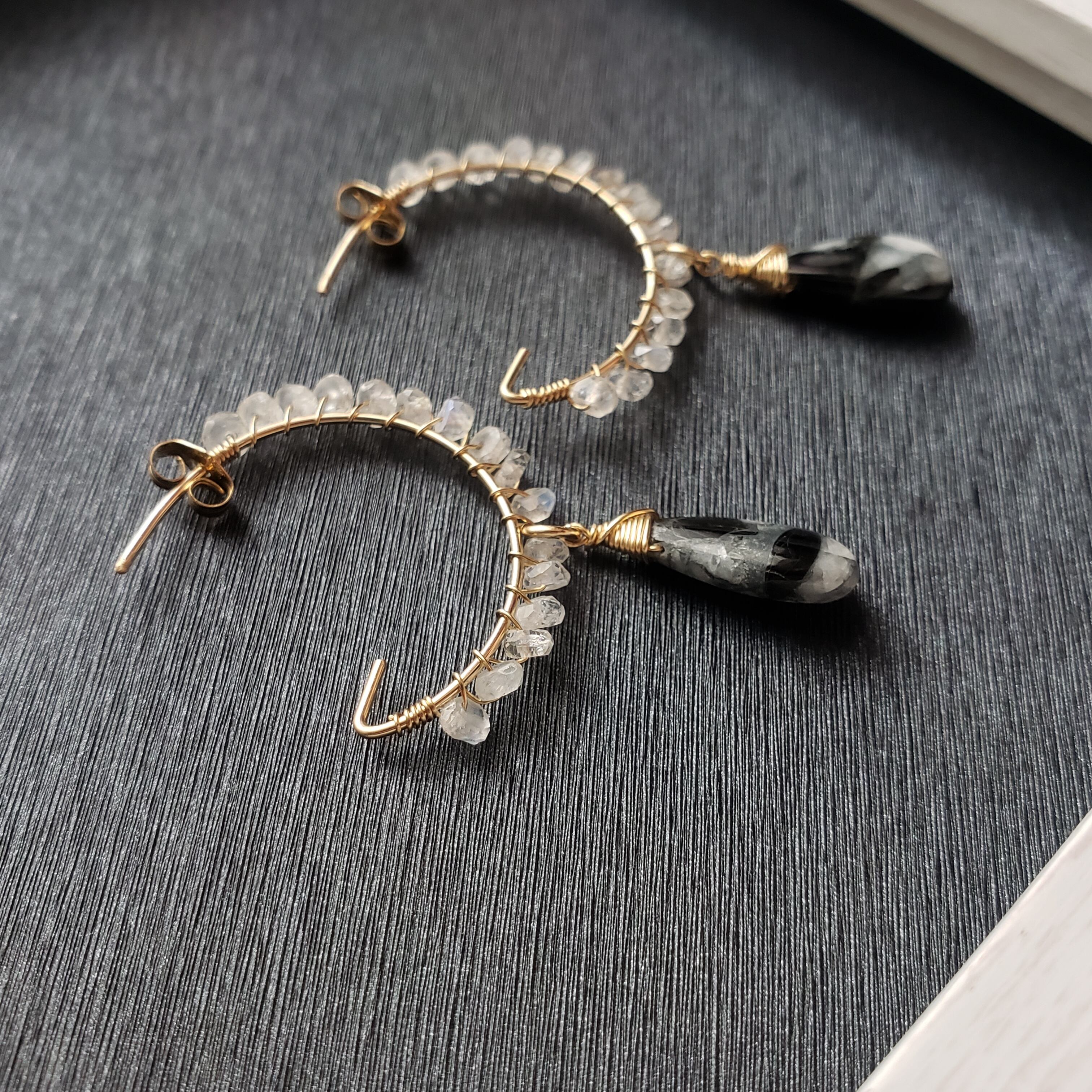 14kgf/lainbowmoonstone×white copperobsidian hooppierce[レインボームーンストーン×ホワイトコッパーオブシディアン フープピアス]